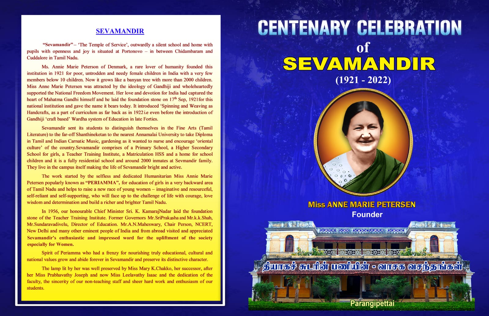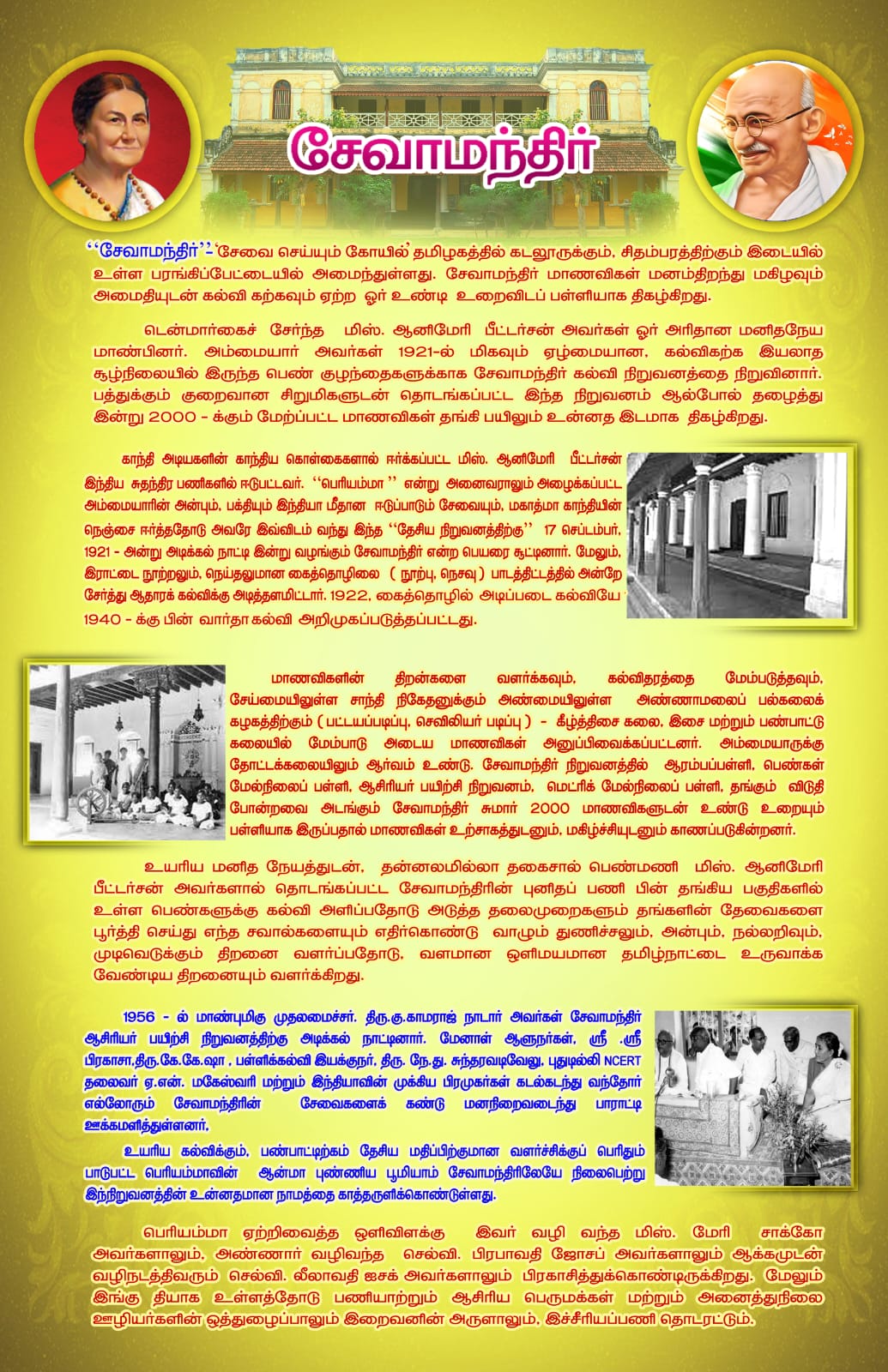 It is both pleasure as well as challenge to chronicle these mementous years. The visual treat exhibits the panoramic view of efforts and achievements of our founder Miss.Anne Marie Petersen, and her successors, teachers, students and the non-teaching staff, and all other Workers in Sevamandir. It has been our sincere effort to gather memories of all those who have made this institution what it is today. It mirrors the vision and mission of the brilliant administrative decisions of its Correspondents, the genius and dedication of the faculty, the sincerity of our non-teaching staff and sheer hard work and enthusiasm of our students.